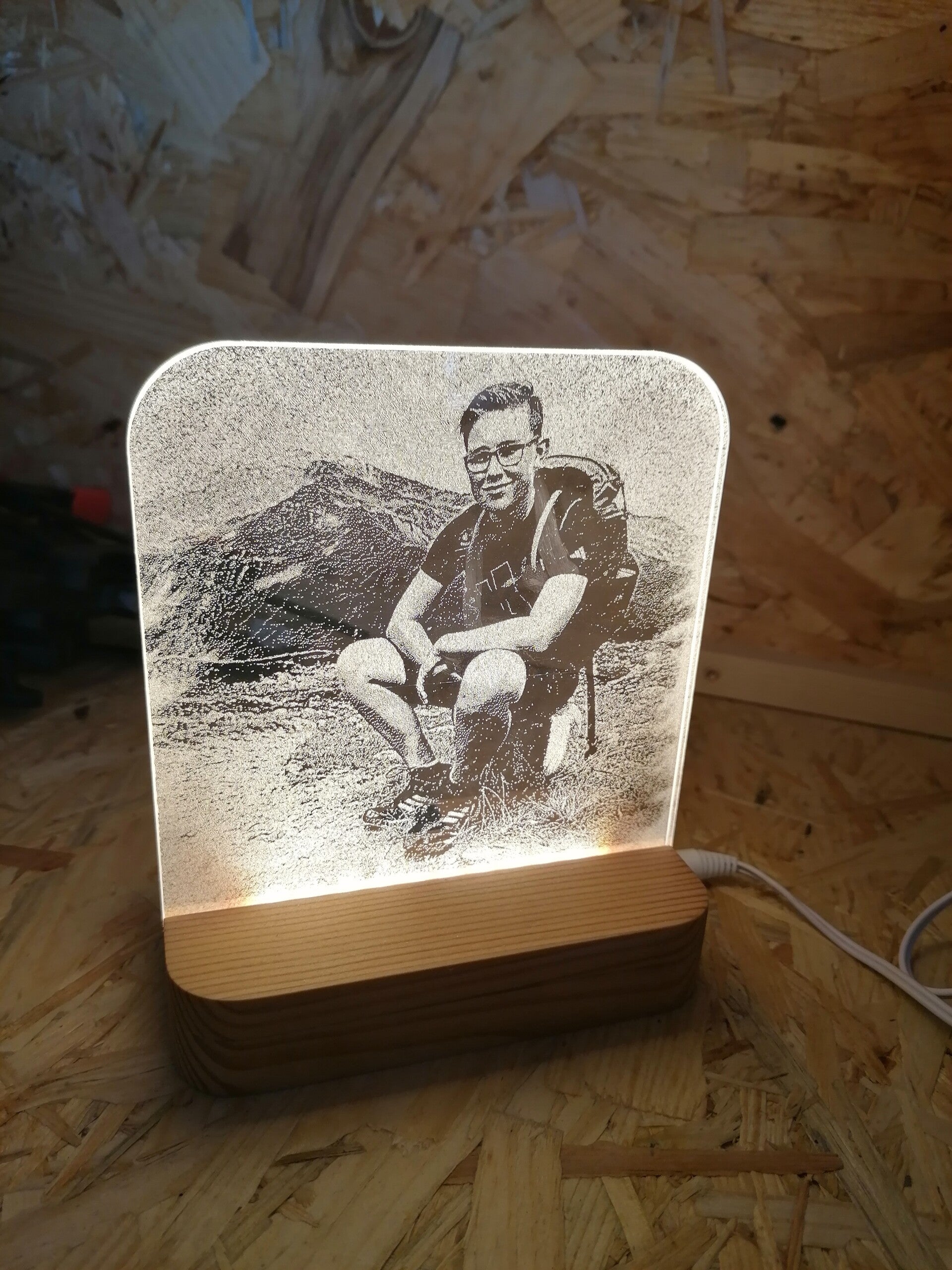 Alle Lampenmotive werden mit Laser eingraviert. Auch Fotogravuren sind möglich.